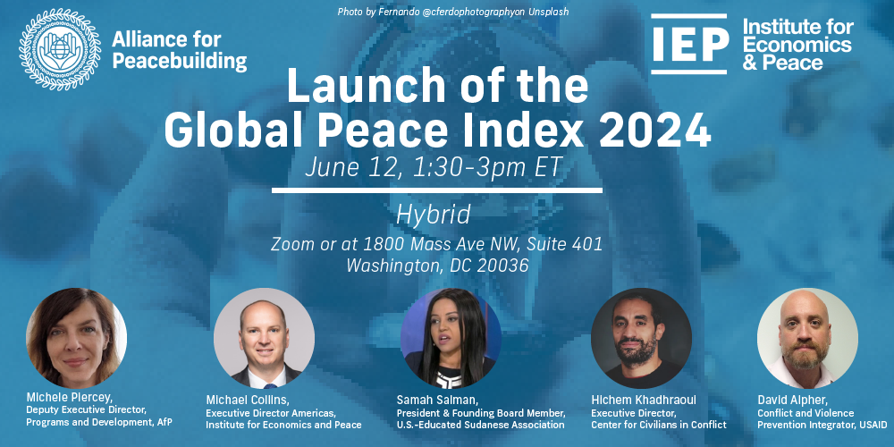 How have recent major conflicts influenced peacefulness worldwide? What is the current cost of violence—from human lives, to economic impact? On Wednesday, June 12th at 1:30pm, please join the Alliance for Peacebuilding (AfP) and the Institute for Economics and Peace for the hybrid launch of the Global Peace Index (GPI) 2024. The GPI is the most comprehensive data-driven analysis on peace, its economic value, trends, and how to develop peaceful societies, covering 99.7% of the world's population using 23 qualitative and quantitative indicators from highly respected sources. The conversation will explore the impact of violent conflict around the world—from Sudan, to Israel-Palestine, to Ukraine, and beyond—and how the peacebuilding field can use this evidence to better build sustainable peace. Stay tuned for more information on speakers.