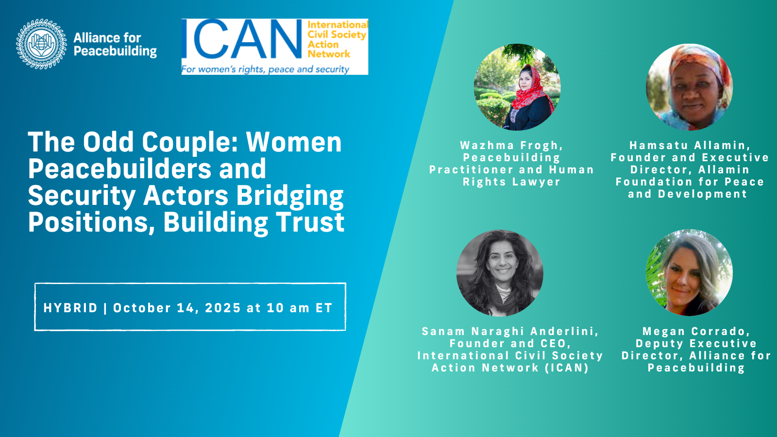 On Tuesday, October 14th at 10am ET, AfP and the International Civil Society Action Network (ICAN) will host a hybrid discussion on the recently launched ICAN report, The Odd Couple: Women Peacebuilders and Security Actors Bridging Positions, Building Trust. With today’s unprecedented geopolitical uncertainty and rising militarization and authoritarianism, the priorities of the Women Peace, and Security (WPS) agenda—advancing human security, recognizing women’s expertise and agency, and preventing and resolving violent conflict—are more urgent than ever. The report highlights how the WPS agenda creates vital entry points for women peacebuilders to engage with security actors, build trust, and reshape local security environments. Women peacebuilders involved in the drafting of the report will explore how its recommendations can be advanced throughout the peacebuilding and WPS community. To attend virtually via Zoom or in-person at AfP’s offices (1800 Massachusetts Ave NW, Suite 401, Washington DC 20036), please register using the links below.