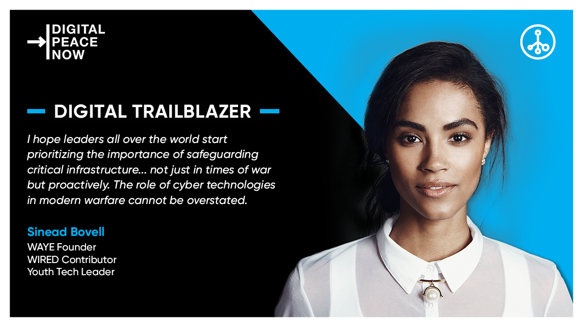 We are thrilled to announce our inaugural Digital Trailblazer honoree is Sinead Bovell. As a futurist, UN speaker, WIRED contributor, and model, Sinead has made it her mission to bridge the gap between the younger generation and the digital future. Sinead is also the founder of WAYE, an education startup that empowers young people to prepare for work, and life, in the digital age. Like the Digital Peace Now movement, she deeply cares about the state of our shared cyberspace and is working to ensure it is a safe and inclusive space for all.