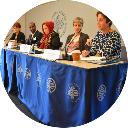 People, Power, and Peace Processes. Pictured, left to right, Nadine Bloch, Aden Abdi, Palwasha Kakar, Dr. Veronique Dudouet, Maria Stephan